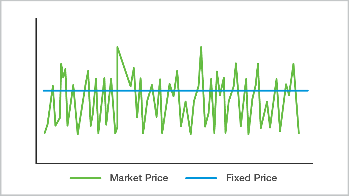 We de-risk this price volatility for you by purchasing electricity forward (set price, future delivered); we do the hedging for you.